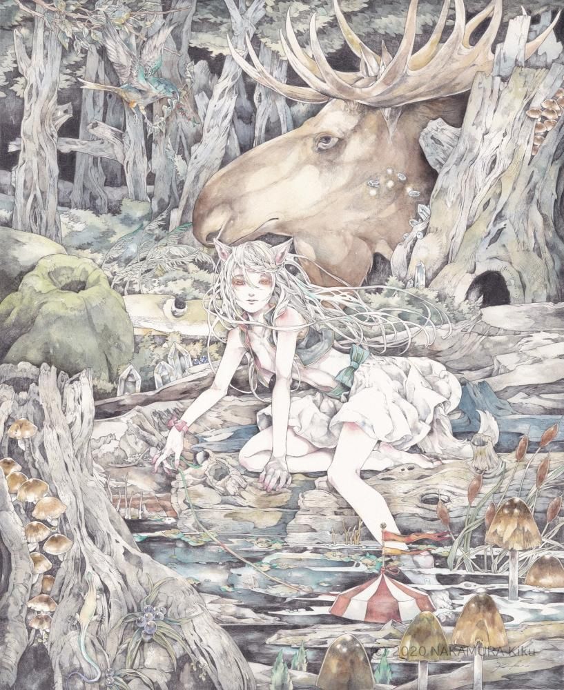 ★★★中村キク 大阪芸術大学在学中に銅版画を専攻。モノクロの鉛筆画を経て、色彩を得た抒情画は、ますます多くの鑑賞者をひきつけている。宮木あや子の小説『ヴィオレッタの尖骨』(2017、河出書房新社)では装画を手掛けた。