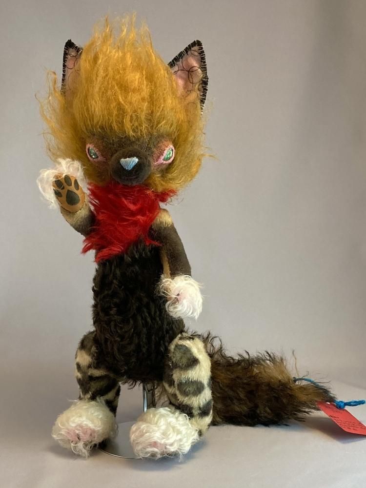 TAROよりも重みを感じるボディ。不意にキラッと光る眼。尻尾を揺らすと、ガラガラと低い音。複数の素材を使い、視覚と触覚・聴覚にまでアプローチする作品。ピンクの耳がチャーミング。