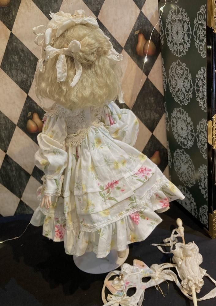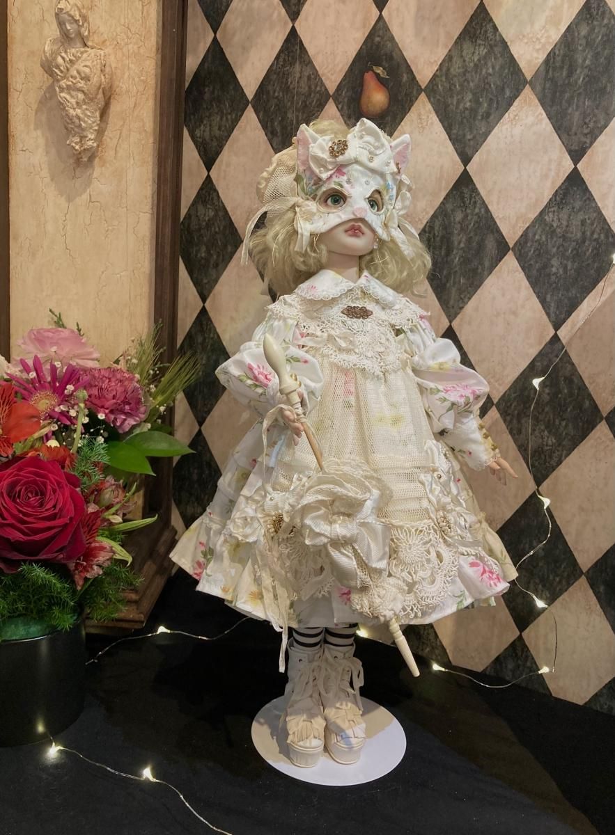 服素材:綿生地・古ドイリー・ヴィンテージパーツ・ミラーパーツ等ビーズ類。ヘッドドレスや猫仮面も服と同様の素材。