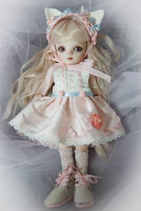 素材詳細:ビスク、グラスアイ、ウィッグ(貼り付け)、ドレス(シルク、シルクリボン、ビーズ他)、ドロワ(綿ローン)、猫耳ヘッドドレス(モヘア、シルクリボン、染め花。ハットピンで留めてある)、靴下、革製靴。専用BOXとスタンド付属。