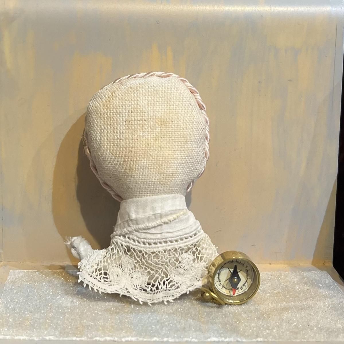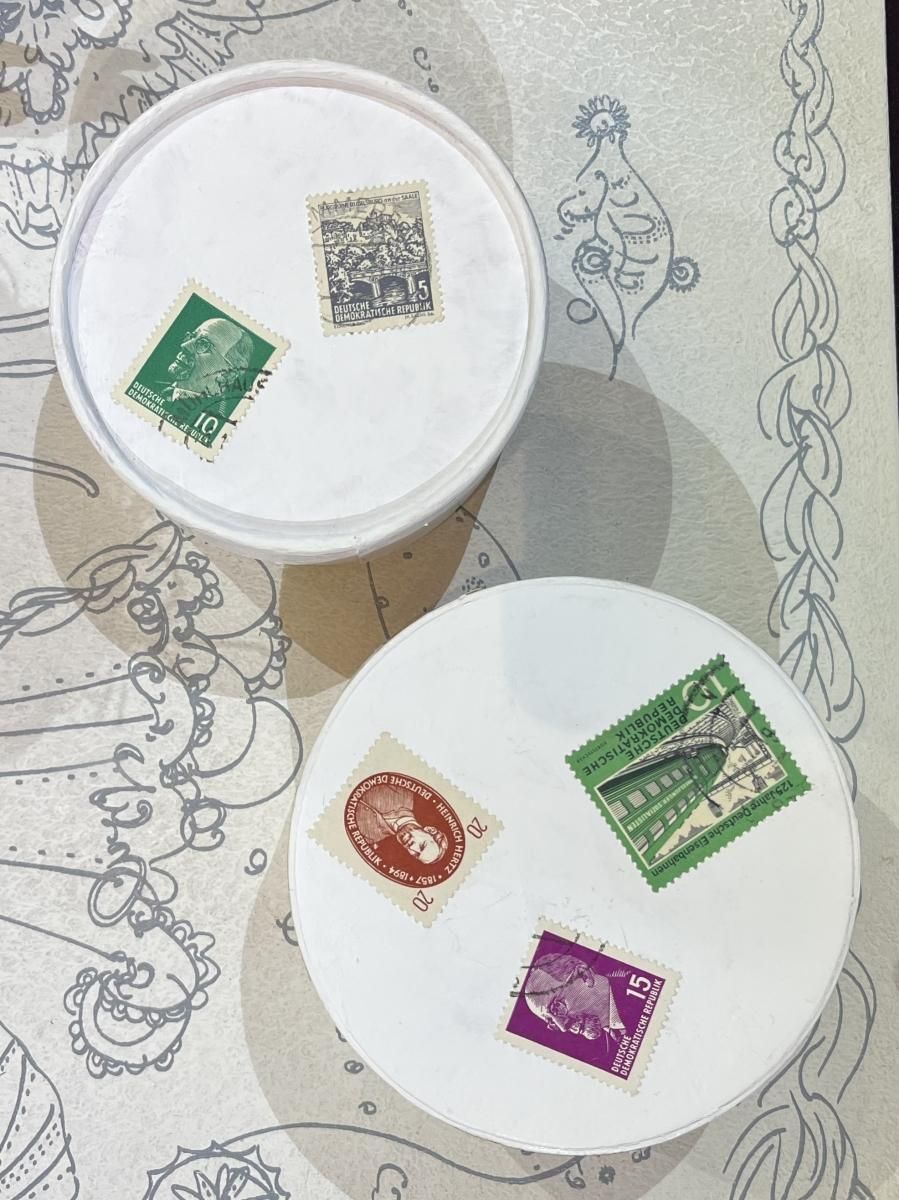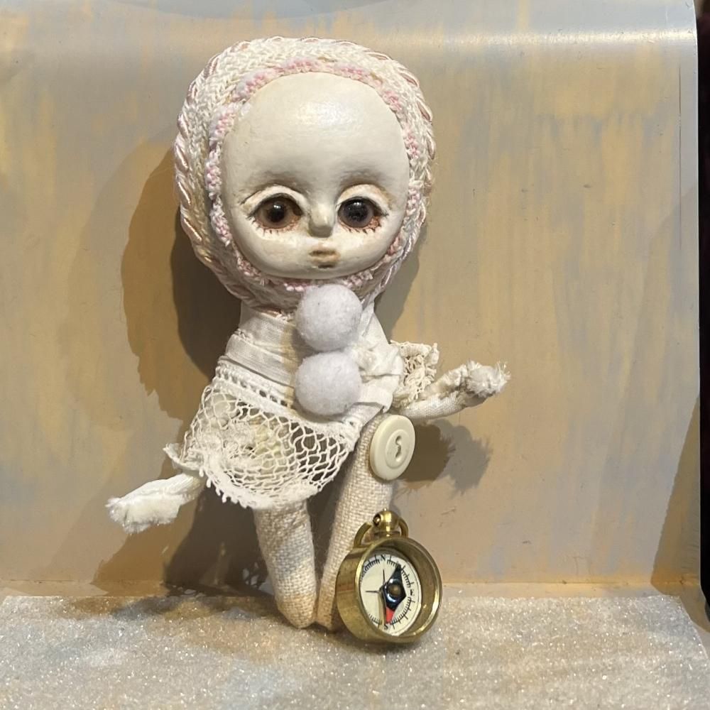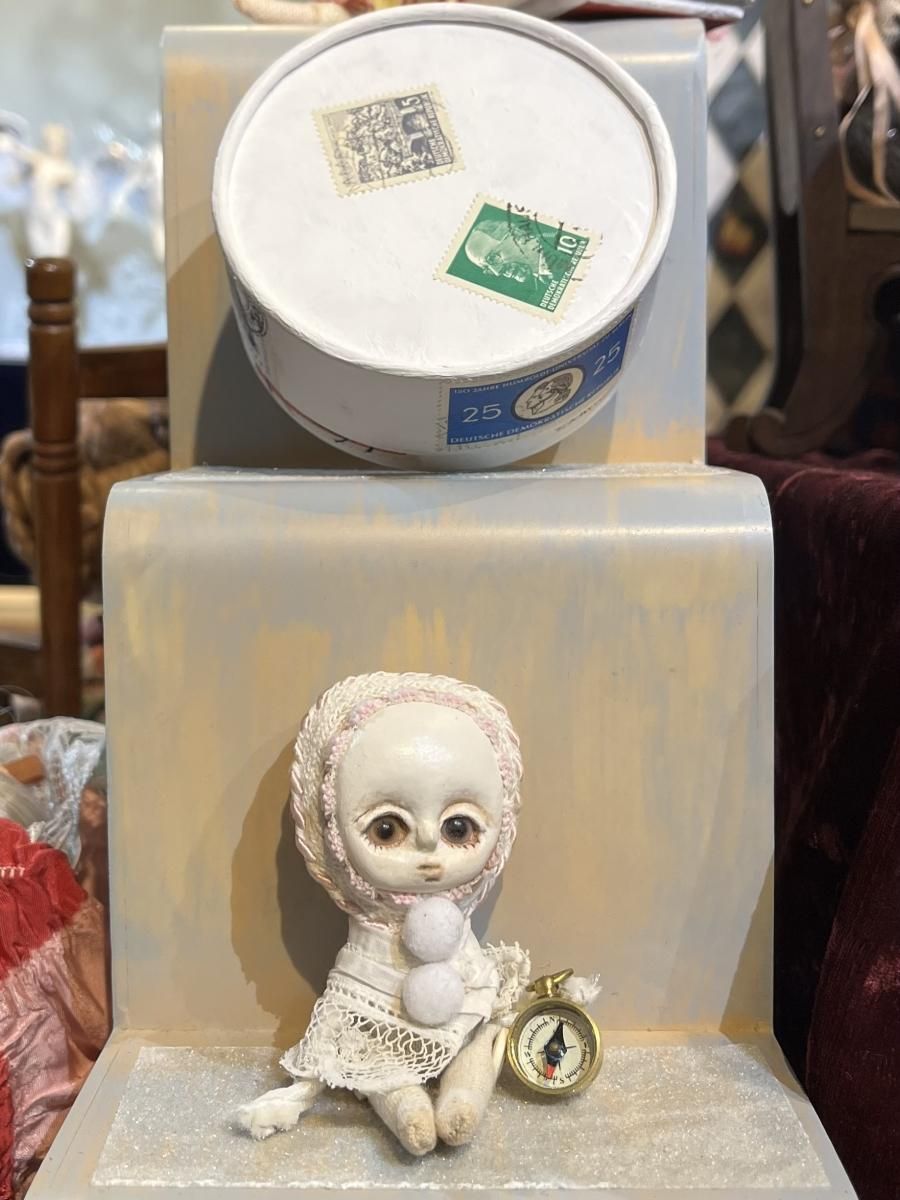 外国の切手がたくさん貼られた箱に住んでいる、コンパスを携えた小さなお人形。