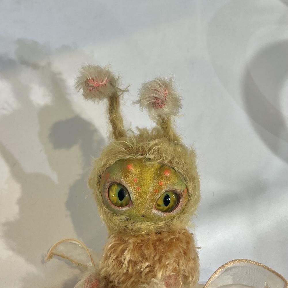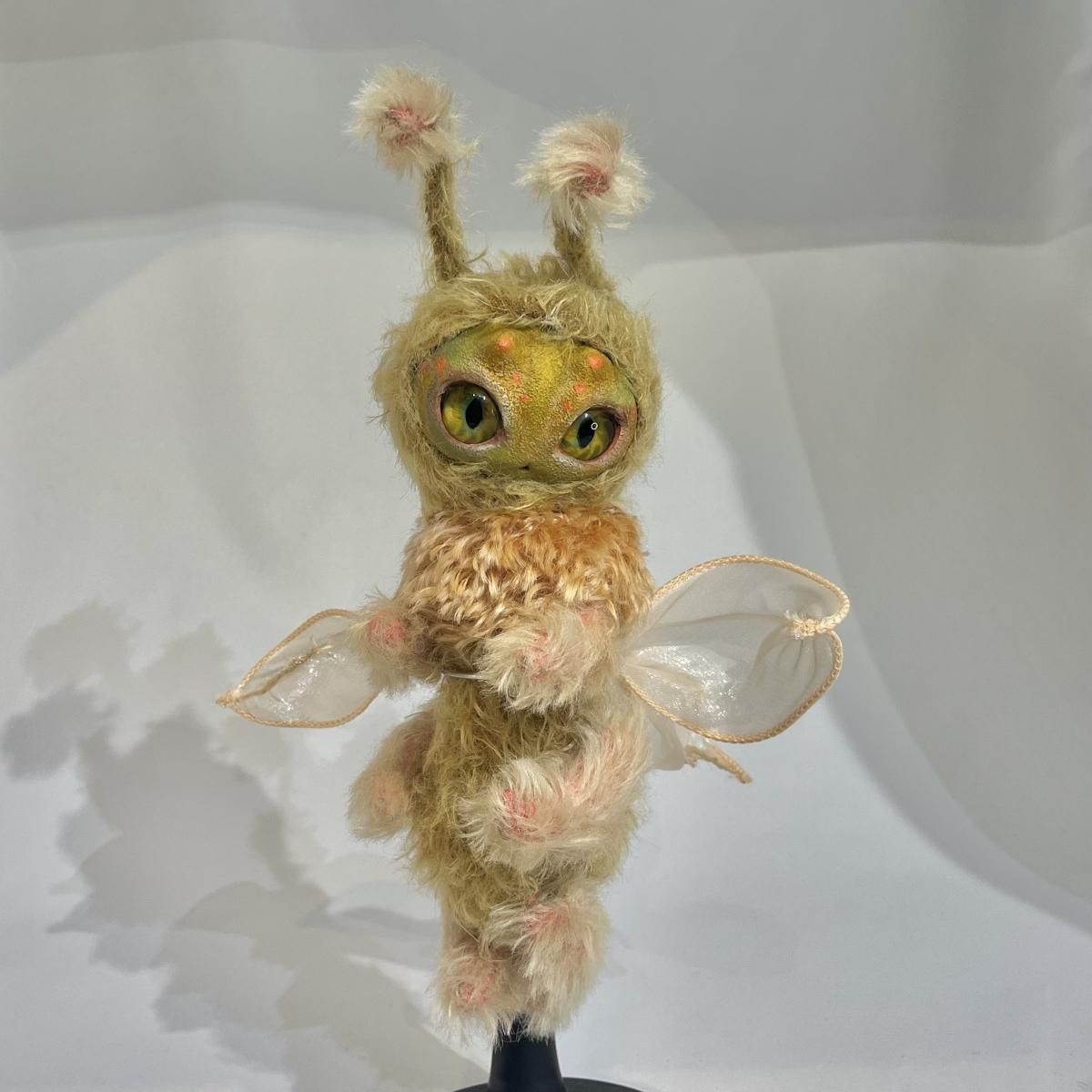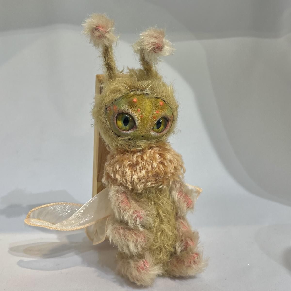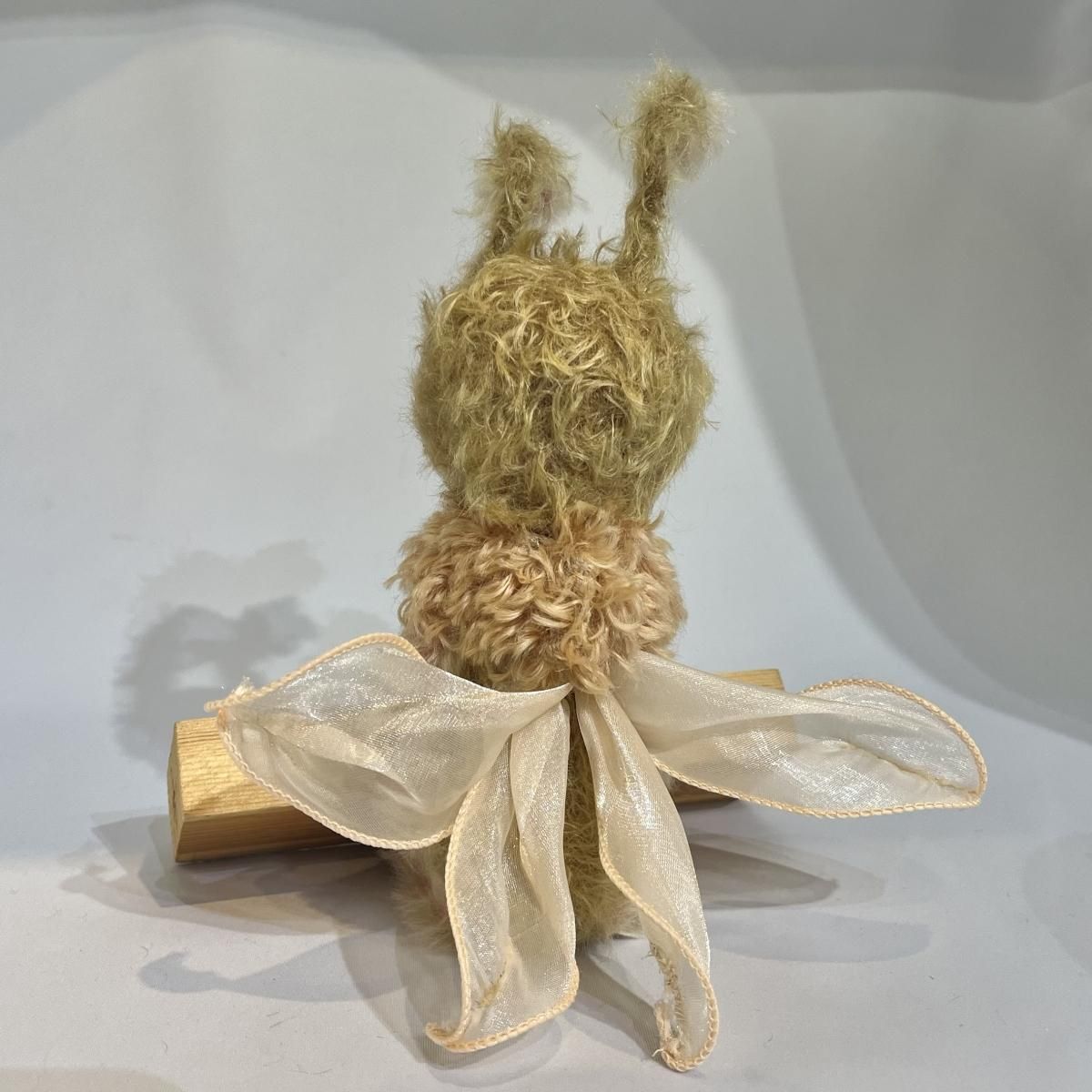 素材詳細:石塑粘土・モヘア・ガラスアイ・油彩・ステンレスボール・シルクサテンリボン