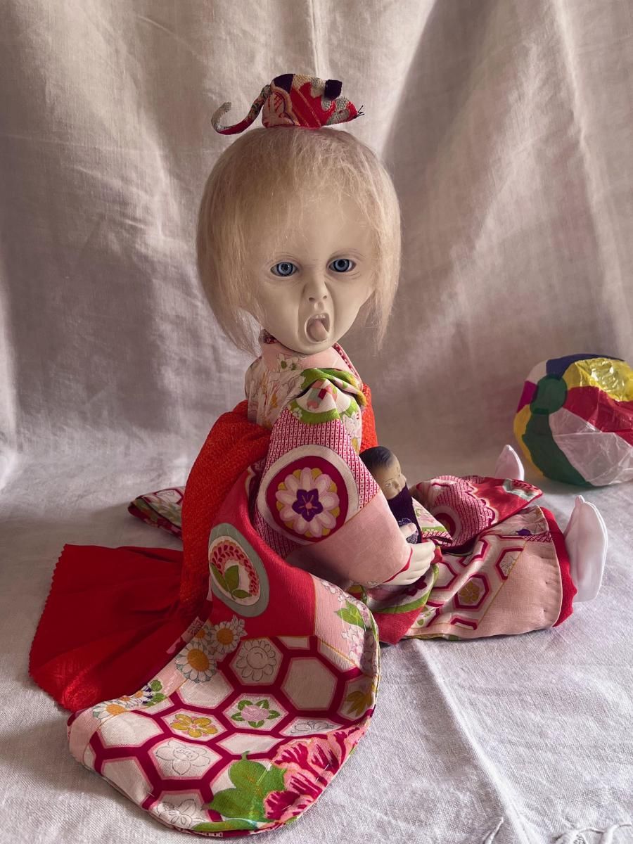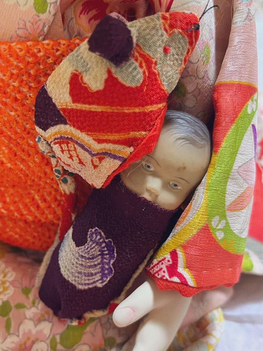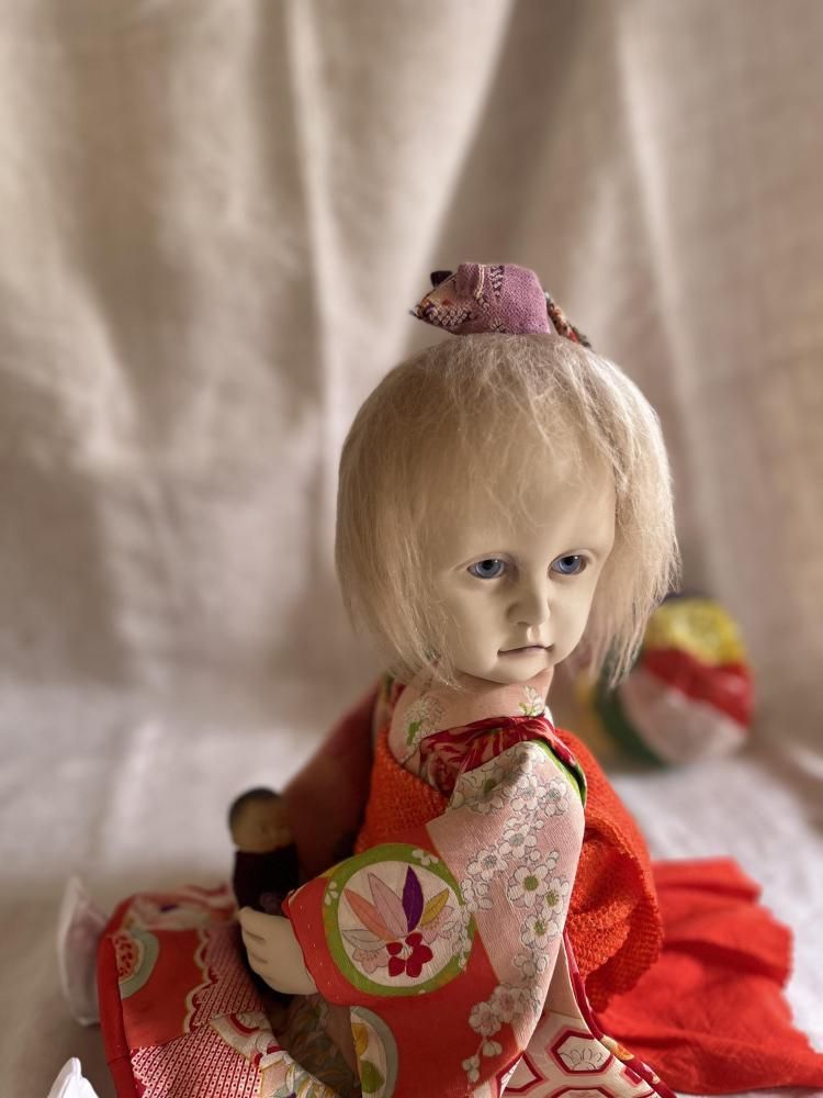 素材詳細:石塑粘土 グラスアイ モヘア髪 正絹お着物 足袋 アクリル仕上げ
